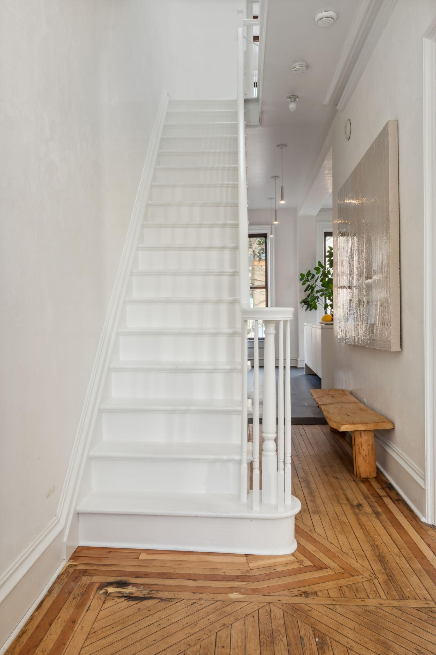 The classic marble and wood foyer leads to a spacious entry and parlor with stripped-to-natural oak floors, original massive doors, Venetian Plaster walls, ultra-high beamed ceilings and an airy volume of space. A glossy white staircase leads to the residential floor.