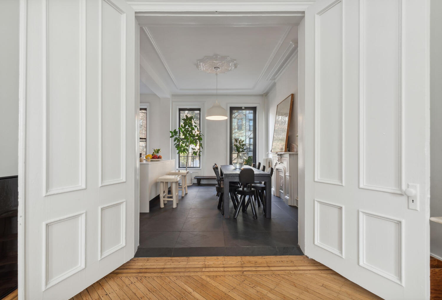 Extra large dining room with heated bluestone floor and original plaster ceiling moldings and center medallions